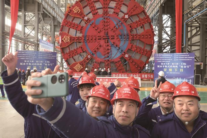 15日,建设者与盾构机合影。当天,由厦门路桥工程公司、中铁十四局集团联合打造的超大直径泥水平衡盾构机“厦金号”在通州湾示范区下线,将应用于厦金大桥(厦门段)A4标主线隧道工程施工。 记者许丛军