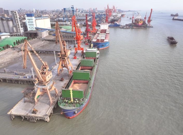 6日,南通粮油接运码头忙碌卸运、转运进口粮食。据南通海关提供的信息,2025年1月,南通海关辖区口岸从美国、澳大利亚、加拿大、俄罗斯等国家进口粮食27.1万吨。