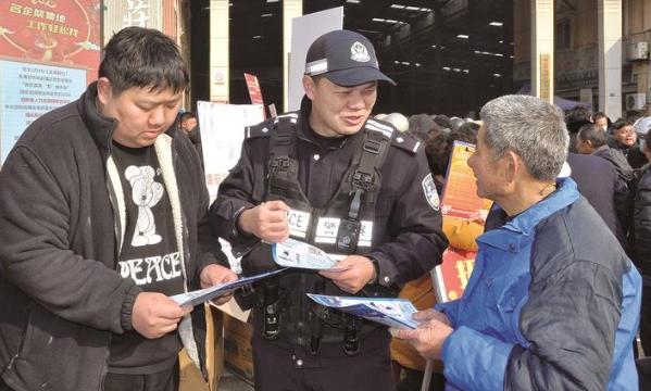2月4日,民警向求职群众讲解反诈防骗知识。海安市公安局滨海新区派出所抓住企业用工人才招聘会的契机,通过设立咨询台、发放宣传资料、现场讲解等方式,向过往求职群众宣传防范电信网络诈骗知识,送上求职防骗“第一课”。 周强