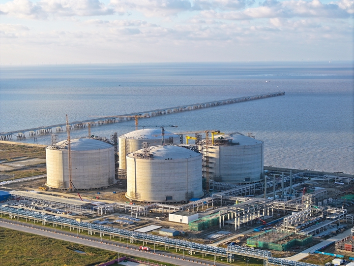 目前,整体项目建设已完成总工程量的75%。其中,江苏省液化天然气储运调峰工程3座储罐主体结构与配套管廊施工全部完成,工艺管道焊接完成约40%,厂前区工程主体部分进入装修阶段;如东国信LNG接收站4号储罐外罐工程全部完工,码头工程施工钢栈桥架设500米,水上沉桩完成403根。“我们将严格按照合同要求倒排工期,高质量完成建设项目,确保2025年底建成,2026年3月底具备首船接卸条件。”项目计划开发部经理刘秋成介绍。
