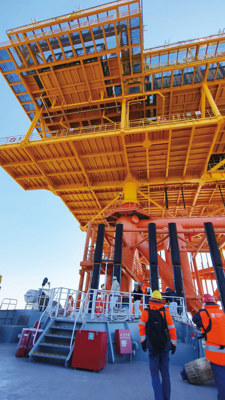 海上升压站是一个庞然大物。四根粗壮的钢柱插向海底,托举起一座四层钢铁建筑。