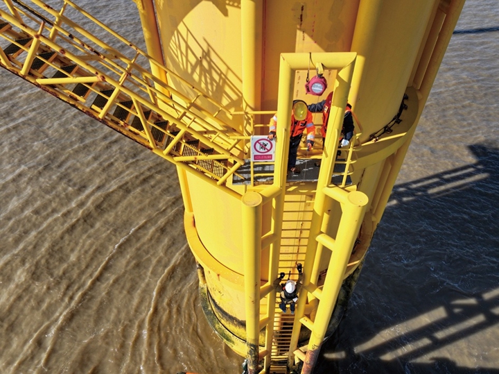 国投11号抵达47号风机。二人组开始整理装备,除救生衣外,还戴上了五点式安全带。记者拎在手上掂掂,安全带足有十多斤。船只抵靠,记者随二人组登机。通往风机作业平台,还有一段十多米高的垂直阶梯。攀爬到阶梯末端时,记者体力不济,好在二人组及时伸出援手。站定后,记者发觉后背已汗湿。