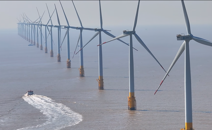 顶部捕风驭电,昼夜不息。站在近百米高的海上风机机舱舱顶,举目四望,蔚蓝的天际线下,大风车列队成阵,缓缓转动,勾勒出一道美丽的风景线。