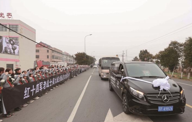 寒气沉沉、哀乐低回,6时58分,搭载着吴九成英灵的车辆从泰州市姜堰区蒋垛镇出发,沿着中国工农红军南通如皋红军小学、江安镇红十四军纪念碑园、磨头镇老户庄战斗遗址等处一路前行。沿途如皋群众自发聚集在道路两旁,手持白花目送灵车远去。