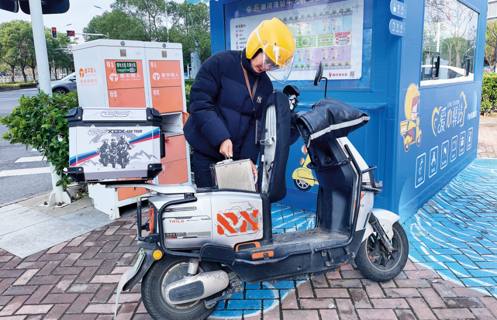 除了骑手友好社区地图,御河湾小区外还设有骑手友好站,虽然只有7、8平方米,却摆放着微波炉、小型饮水机、手机充电器等,可谓“麻雀虽小五脏俱全”。这里还长期提供泡面、小面包等,社区工作人员每隔一段时间就会及时补货。驿站外还设有电动车电池专用换电柜,骑手们自行扫码就能完成换电。