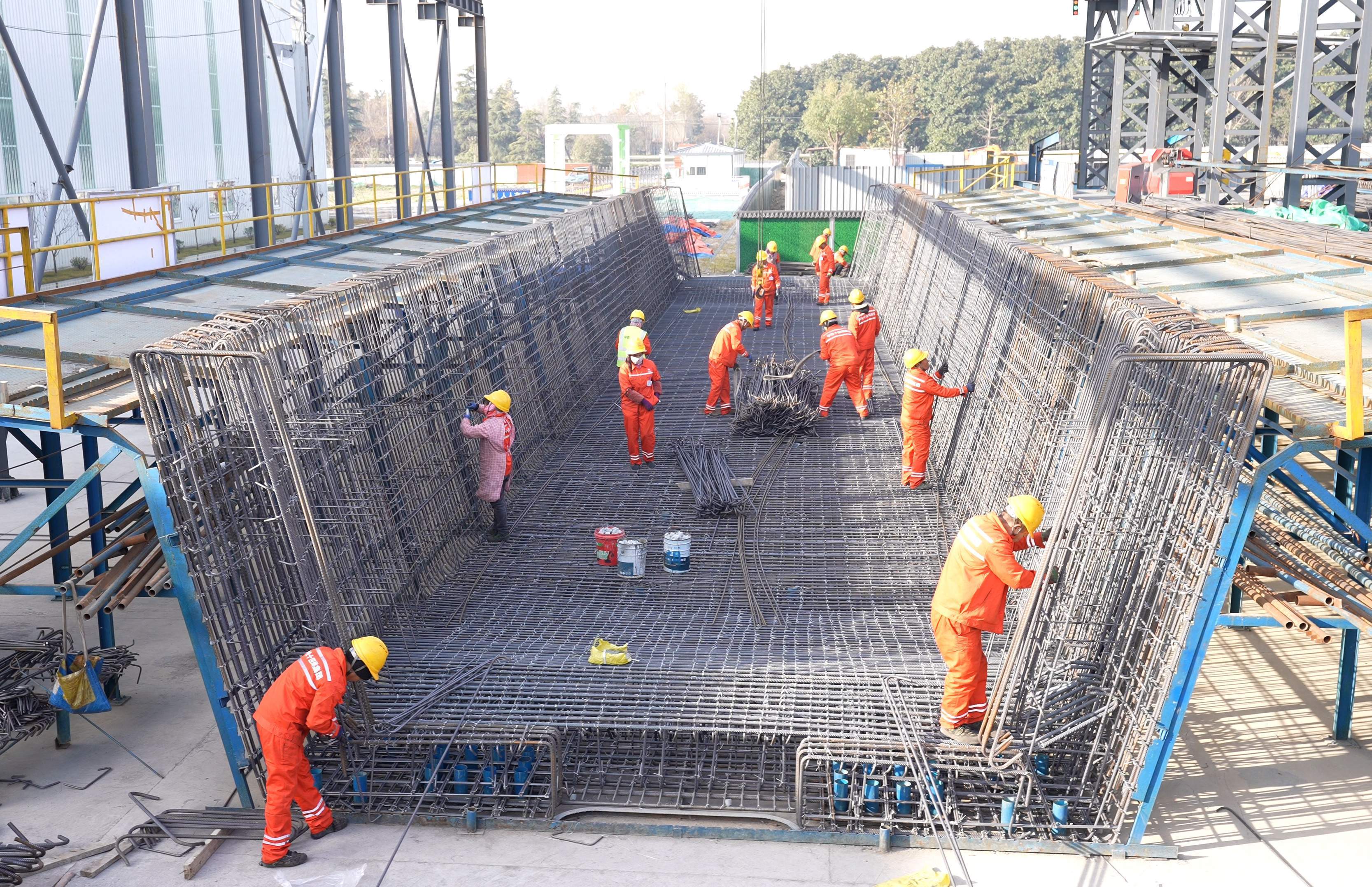沪渝蓉高铁如皋制梁场内工人在绑扎钢筋。杨阳摄