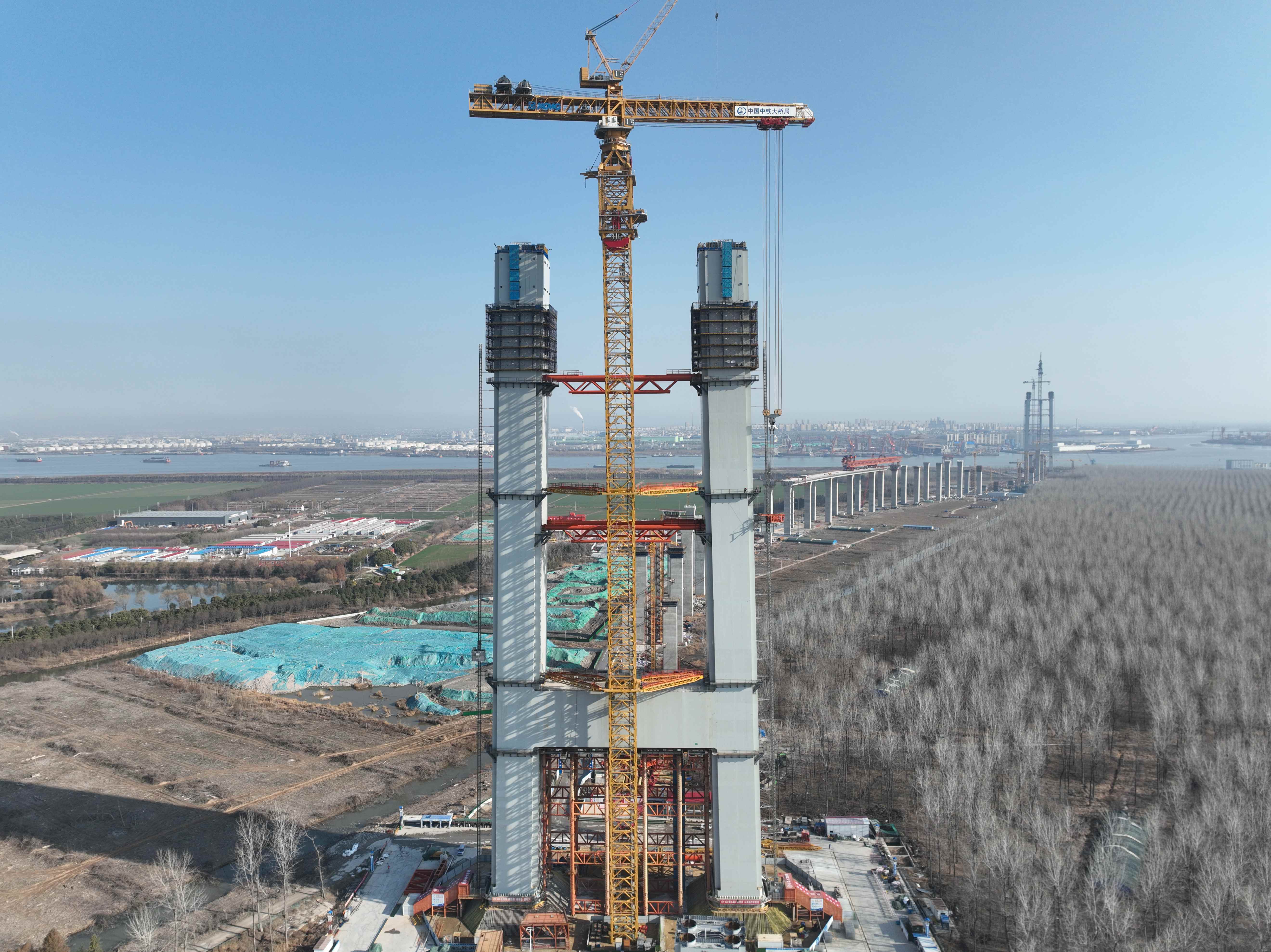 沪渝蓉高铁南通段全线掀起大干热潮。2月17日,启东长江边,在中铁大桥局沪渝蓉高铁控制性节点工程——崇启公铁长江大桥施工现场,履带吊旋转,机器轰鸣,大桥3号主塔墩正在进行第11节钢筋绑扎,目前主塔施工累计完成60.65米;非通航孔桥第七轮钢梁拼装接近尾声,累计顶推长度546米,重量达16970吨。