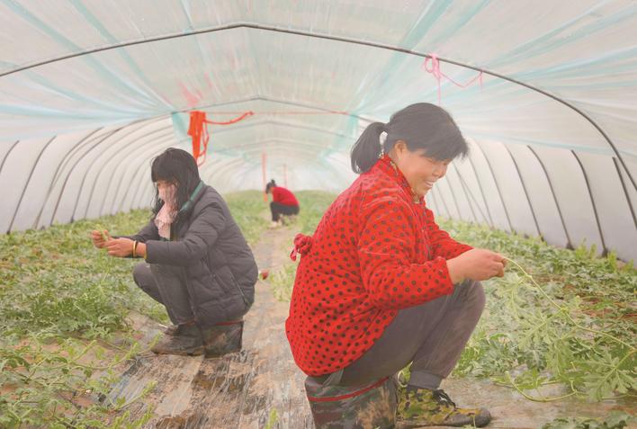 5日,惊蛰节气,江心沙农场工作人员在大棚内忙着整枝、打杈、留瓜,确定合理株型和花果数量。据了解,此举能综合提高空气流通和光照、养分利用效率,同时减少病虫害发生风险。
