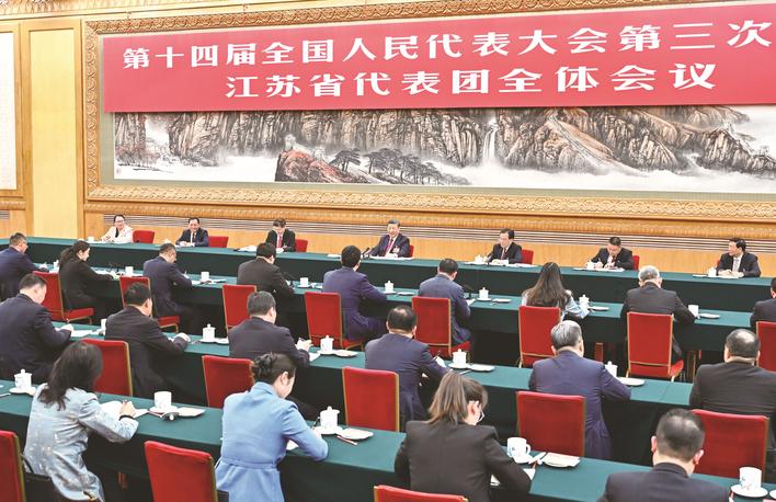 五日下午,中共中央总书记、国家主席、中央军委主席习近平参加他所在的十四届全国人大三次会议江苏代表团审议。 新华社照片