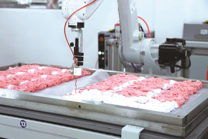 该生产线由江苏华艺集团联合东华大学等单位历时三年共同研发制造,于去年9月启动试生产;生产线包括AI智能注染打样机器人系统和AI智能注染全自动流水线,通过机器人软件连接、视觉检测等,实现了传统手工扎染向数字化扎染转型、AI智能注染机器人示教“0”编程、全自动换色、产品视觉检测、可自主创作、多系统之间交叉融合6个突破。