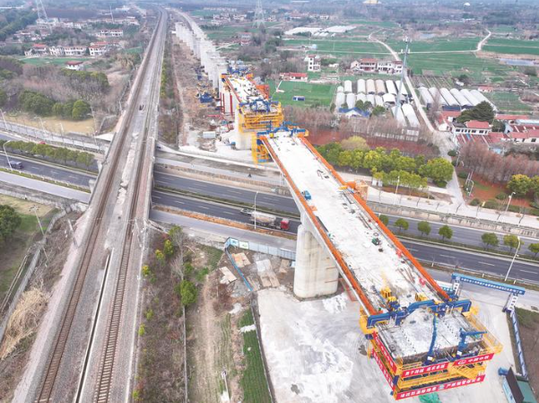 6日在崇川区幸福街道辖区拍摄的北沿江高铁跨城北大道施工现场。目前,北沿江高铁江苏段多个控制性节点工程有序推进。北沿江高铁江苏段开通后,将填补江苏长江北岸地区的高铁空白,苏中的南通、泰州、扬州将全面融入上海、南京的“1小时高铁圈”。 记者 许丛军摄