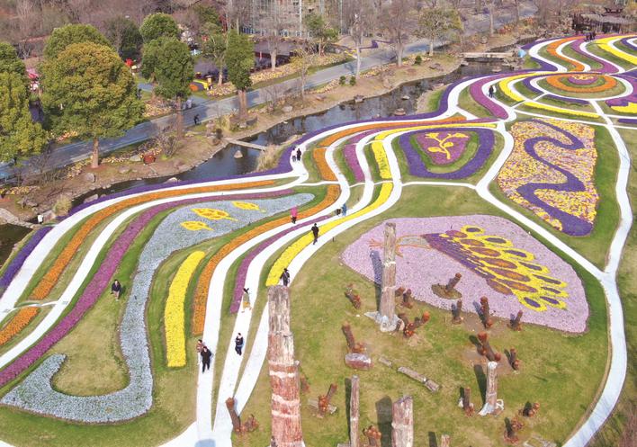 16日在通州区先锋街道拍摄的南通洲际绿博园梯田花海美丽景色。梯田花海通过花草色彩、图案等展现春季景观。据悉,绿博园是江苏省科普教育基地,汇聚了来自世界各地的树木、花草,每个季节都有特色花海。 记者 许丛军摄