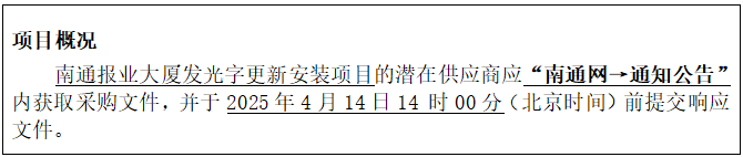 江苏建达全过程工程咨询有限公司(以下称代理机构)受南通日报社(以下称采购单位)的委托,就其举办南通报业大厦发光字更新安装项目组织争性磋商采购,诚邀符合条件的潜在供应商参加该项目的竞争性磋商。