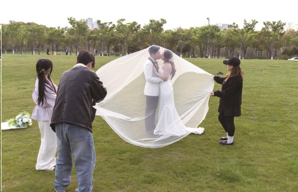 昨天,在市区府东路大草坪上,一对新人在拍摄婚纱照。最近,通城风和日丽,吸引了很多准新人扎堆拍照,留下美丽瞬间。 记者黄哲