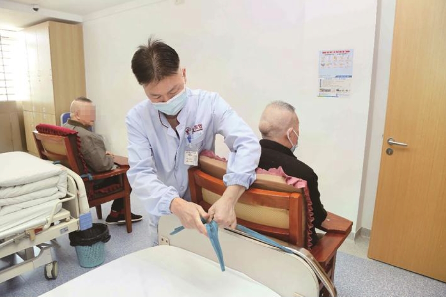 这里推行的是“免陪护服务”。“与普通精神科的‘无陪病区’不同,我们病区的医疗护理员是由专业陪护公司提供的,并配有专职陪护管理老师进行指导和检查。”护士长邱海燕介绍,目前,病区住院患者一半以上为超过80岁的高龄老人,除一人外,其余患者家属均选择了“免陪护服务”。