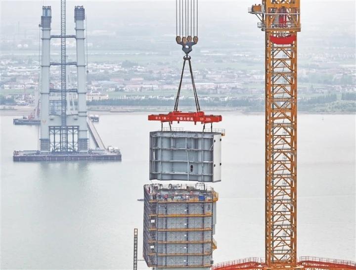 17日,张靖皋长江大桥南航道桥北主塔T20节段钢箱吊装圆满完成。在大桥建设者的精准操作下,随着15000吨米级塔吊缓慢上升,一块重达275吨、高10.8米的钢塔节段在200米高空完美对接。截至目前,北主塔已成功攀升至219米的新高度,累计完成进度69%。