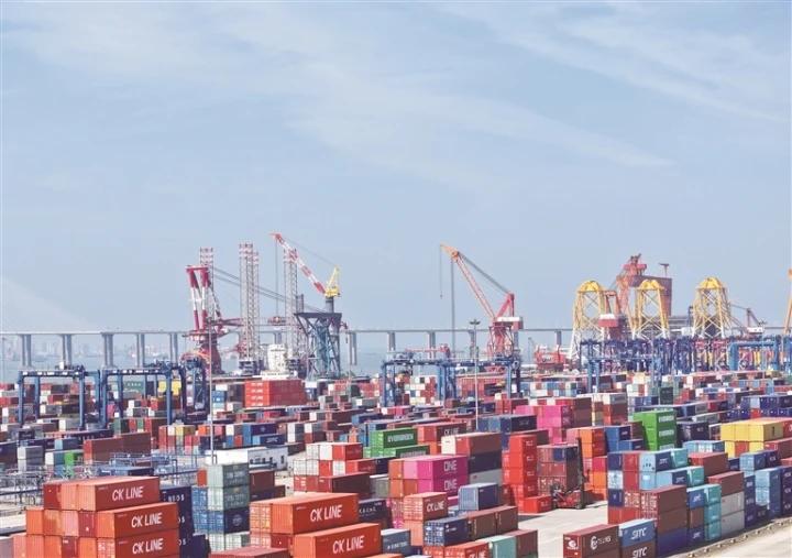20日拍摄的南通港通海港区集装箱码头和堆场。据了解,南通港通海港口一季度累计完成集装箱吞吐量405312.5标箱,同比增长2.8%。