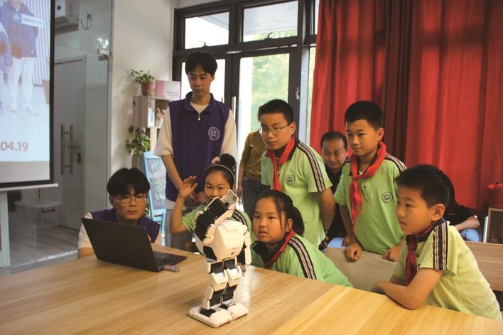 19日,崇川经济开发区关工委、中沙社区关工委联合组织青少年学生开展实践拓展活动,同学们在志愿者的指导下操作“机器人”跑步、敬礼、俯卧撑等动作,感受科技力量,传承科学精神。