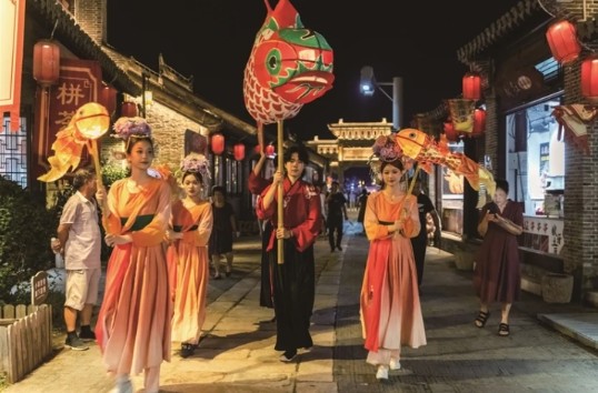 一眼千年,动静相宜。立足文化根基,古镇打造了镇民共建广场、汪刃锋版画艺术馆、大东旅社、一柱楼、耕读居、南沙书场、志远美术馆、鼎新棋院、关帝庙、杂技训练基地等一系列文化艺术场馆,并推出廉洁教育游、非遗体验游、换装美拍游、美食美宿游、夜美栟茶游等线路,解锁古镇N种玩法。与此同时,在栟河灯光秀、东莱阁灯光秀的基础上,创新性开展“不夜栟河水上秀场”“古街小舞台秀”等现场表演,通过线上线下联动的方式,带领更多市民游客感受不夜栟茶的独特魅力。