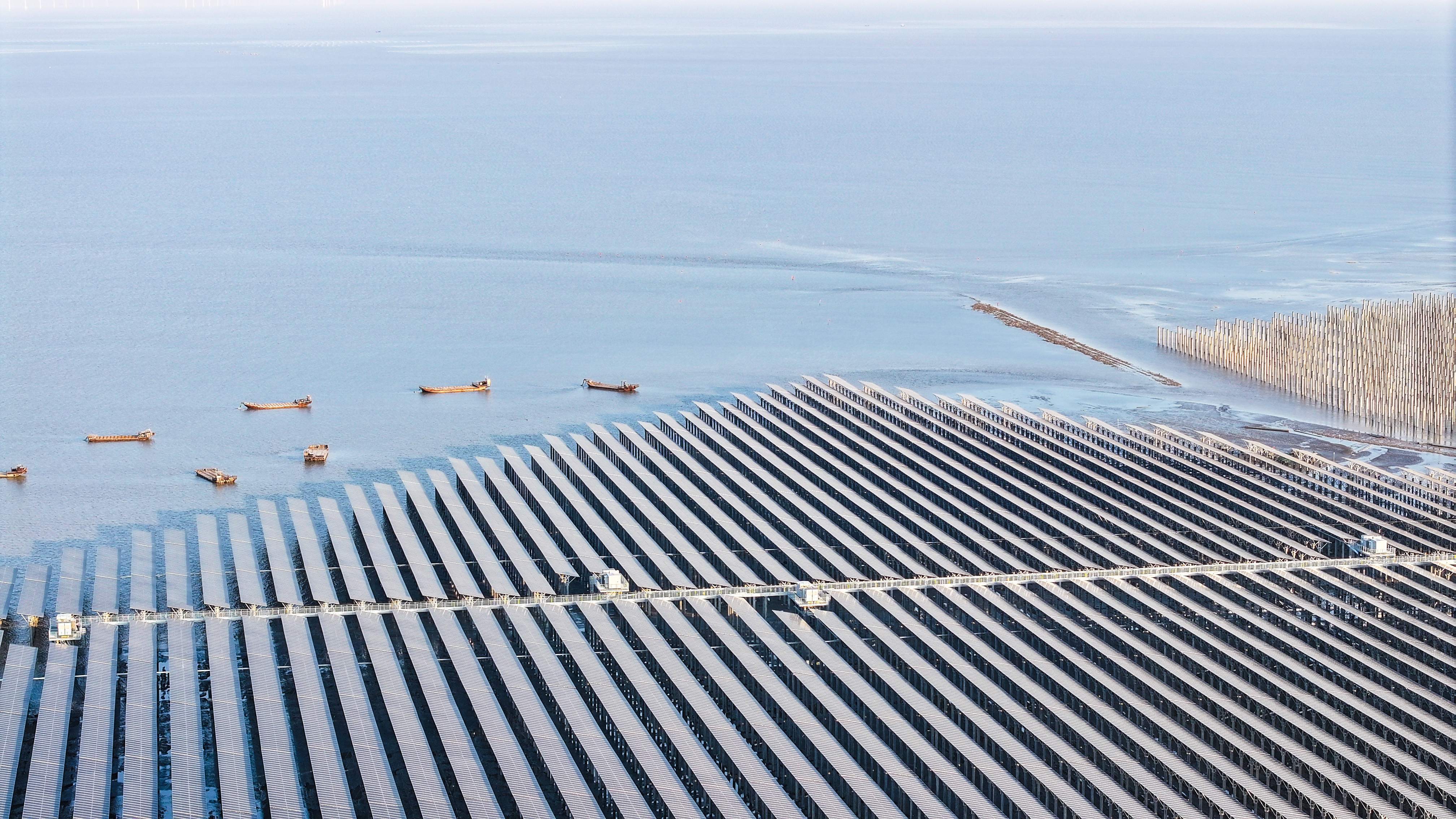 目前,40万千瓦、共计120个阵列的光伏板已在这片海滩上铺展开来,可有效抑制互花米草的光照条件。同时,光伏板下还增加了约4800亩的可利用区域,未来,可通过板上发电,板下养殖的发展模式,为当地渔民增收300余万元。
