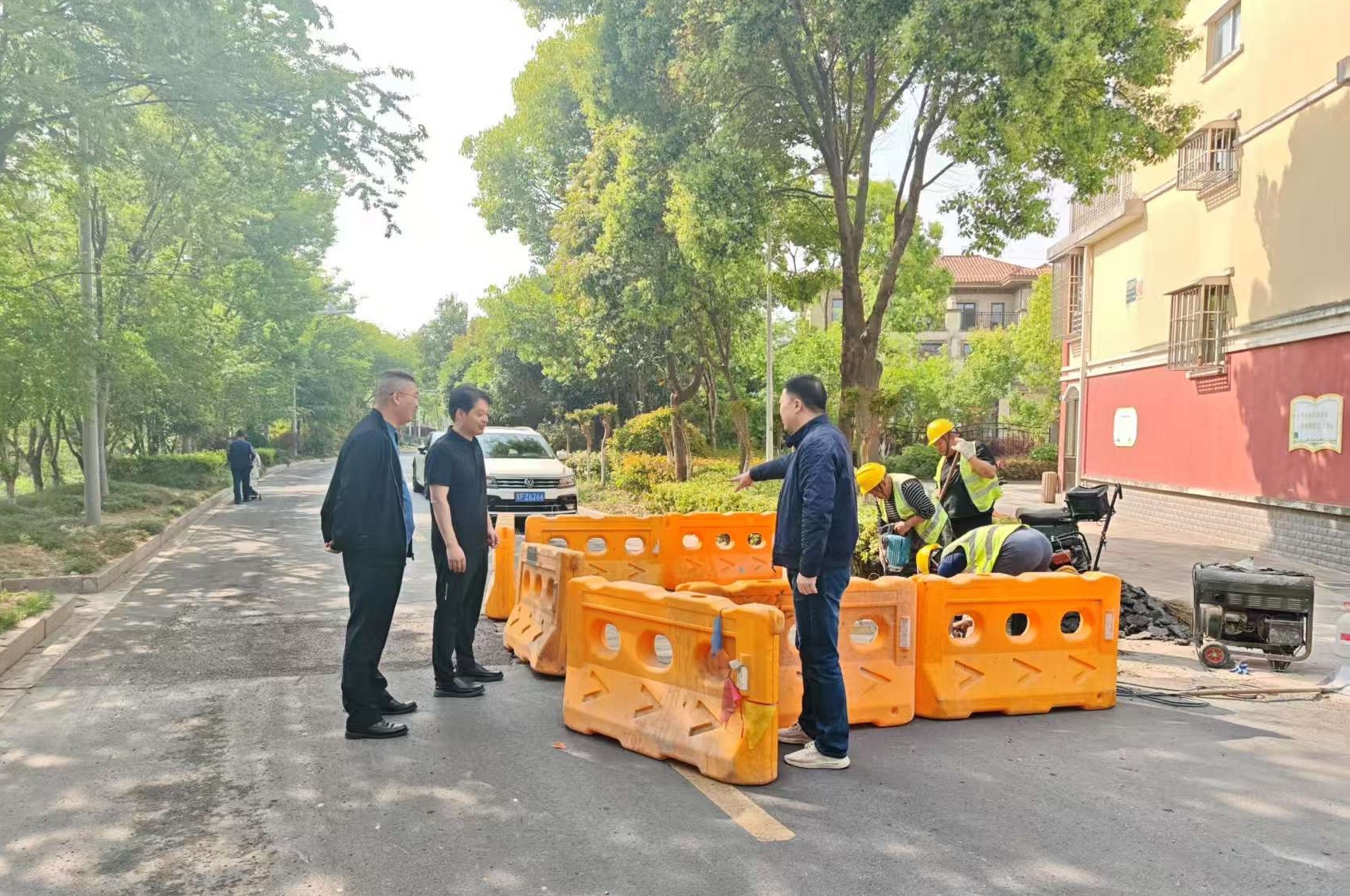顶部4月23日一早,江苏南通海安市城建集团的3名水务工人,来到海安市城南花苑南区门口填坑修路,并铺上沥青。