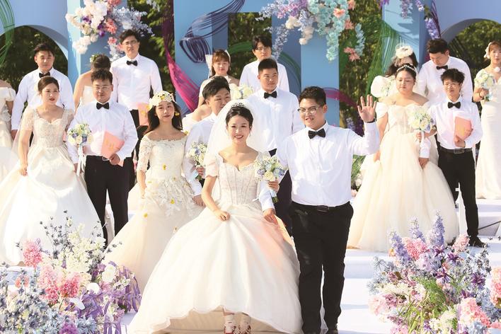 4日,青年爱侣在海安市上湖户外结婚登记颁证基地举行的集体婚礼现场。当日,“情定海安 ‘缘’来有你”户外集体婚礼在海安市上湖户外结婚登记颁证基地举行,来自海安市多个行业的30对新人喜结连理,共迎人生最幸福的时刻。 顾彬斌