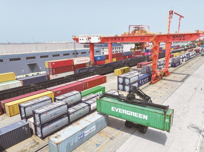 昨天,位于海安商贸物流园的中国铁路上海局集团海安物流基地正在进行集装箱装运作业。今年前4个月,海安海铁快线班列发运246列11744车。据介绍,海铁联运因运送能力强大、运输成本低廉、到货时间精准等特点,受到外向型企业青睐。铁路部门将持续推动海铁联运增运上量,让越来越多的产品通过海铁联运走向世界。