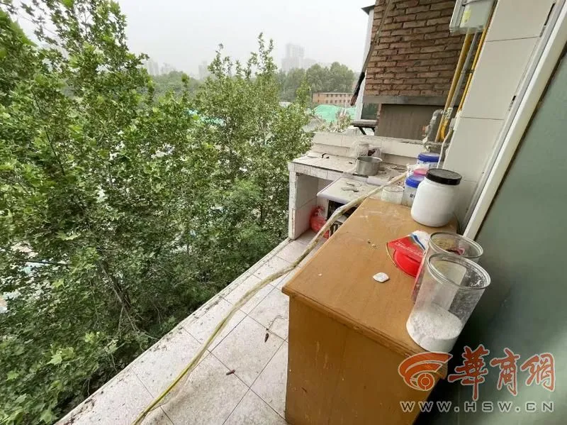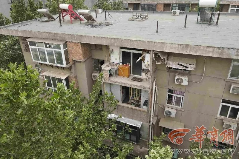 5月6日上午,接到居民反映后,华商报大风新闻记者来到西北有色地质研究院生活区,在小区最里面的3号楼一单元楼下看到,阳台下方位置拉着警戒线,地面上还有一些残留的土块。向楼上望去,各家都给阳台封了窗户,两侧半截砖墙应是自行垒砌。西户顶楼的5楼和4楼封阳台的窗户均不见踪影,且5楼窗户下的墙体整个不见了,东侧的上部分砖墙也已消失,西侧的砖墙上还挂着燃气热水器。4楼则主要是窗户坠落,几侧墙体还在。3楼阳台窗户玻璃上能看到明显裂纹,3楼和2楼窗户上的顶棚也有损坏。