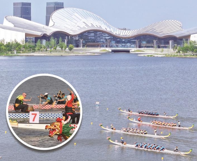 11日,一场趣味龙舟赛在通创区紫琅湖水域举行,30多个国家的数百位选手参与龙舟赛和风筝、糖画、蓝印花布等中国传统民俗体验活动。 记者 许丛军摄