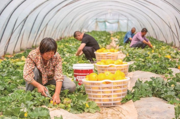 昨日,通州区东社镇兴隆灶村的村民在采摘黄金瓜。近年来,兴隆灶村大力发展果蔬种植,探索多元发展模式,目前黄金瓜、番茄、黄瓜、西瓜等相继上市,推动了农业增效、农民增收,为乡村振兴注入新活力。 翟慧勇摄