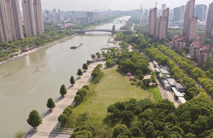 5日拍摄的崇川区通吕运河绿廊美丽景色。近年来,崇川区以建设公园城市为目标,努力打造“城在绿中,林在城中,楼在园中,街在景中”的绿色生态体系,实现了300米见绿、500米见园,崇川建成区绿地率41.35%,人均公园绿地面积18.30平方米。 记者 许丛军摄