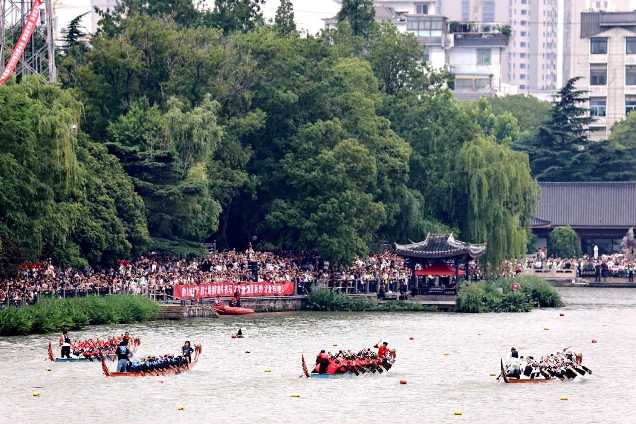 端午的通城,千年濠河水面沸腾,呐喊声、欢呼声此起彼伏。5月31日,2025年“国缘杯”长三角濠河龙舟邀请赛在南通北濠河水面拉开帷幕。来自中国、法国、德国、新加坡、澳大利亚、马来西亚等国家和地区的16支队伍、超400人,以桨为笔,以浪为墨,展开激烈的角逐。赛事为媒,濠河畔的环西文化广场及其周边,水上节目展演、千人街舞大赛、广场促销活动、市运会龙舟赛、江苏省龙舟俱乐部联赛等一系列配套活动陆续展开。安徽游客宋宇带着家人在北濠桥观看比赛后,步行去探访钟楼、寺街、西南营等地,她感慨主城区里历史遗存经过活化利用,充分展现了地域文化特色,还成为拍照十分出片的网红地标。