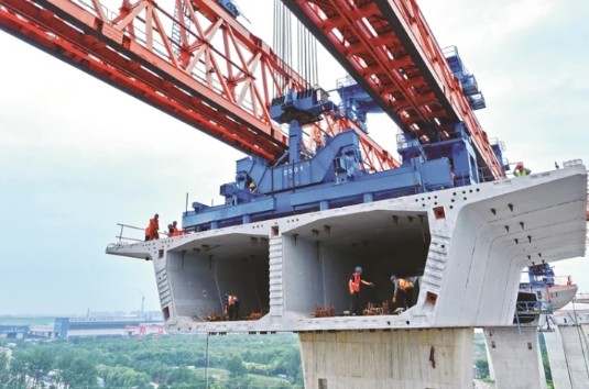 顶部昨天,如皋长江镇,工人在张靖皋长江大桥北航道桥施工现场进行施工作业。当前,张靖皋长江大桥北航道桥工程正在按照建设节点要求高标准、高质量推进。 薛冯 吴树建摄