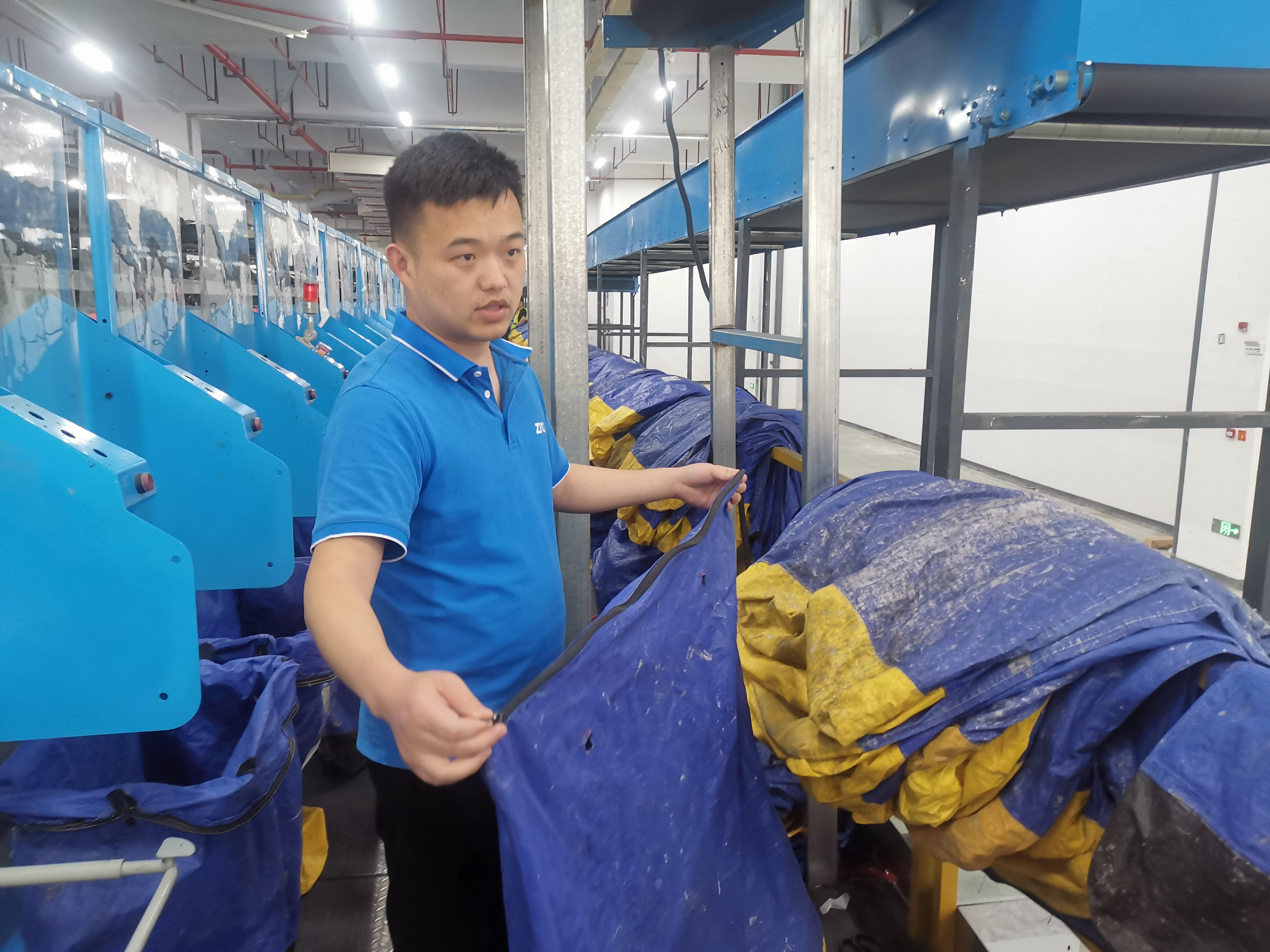 “中通快递在6月1日前就已经全面推行环保包装袋,所有网点目前已全面使用该包装袋。”站在生产车间内,中心经理蒋锋指着蓝色的、印有“中通快递”字样的包装袋说,“这种环保包装袋装有芯片,通过科技加持,可追溯货物在运输过程中的位置、状态等整个物流过程,适用于各类快递货品。包装袋是总部特别指定的生产商为中通快递专门研制生产的,设置有拉链,在无人为损伤的情况下至少可以使用半年;如果磨损严重无法继续使用,则由总部统一回收、维修、翻新,然后再将环保包装袋重新分配到各个仓储中心进行二次循环利用。”