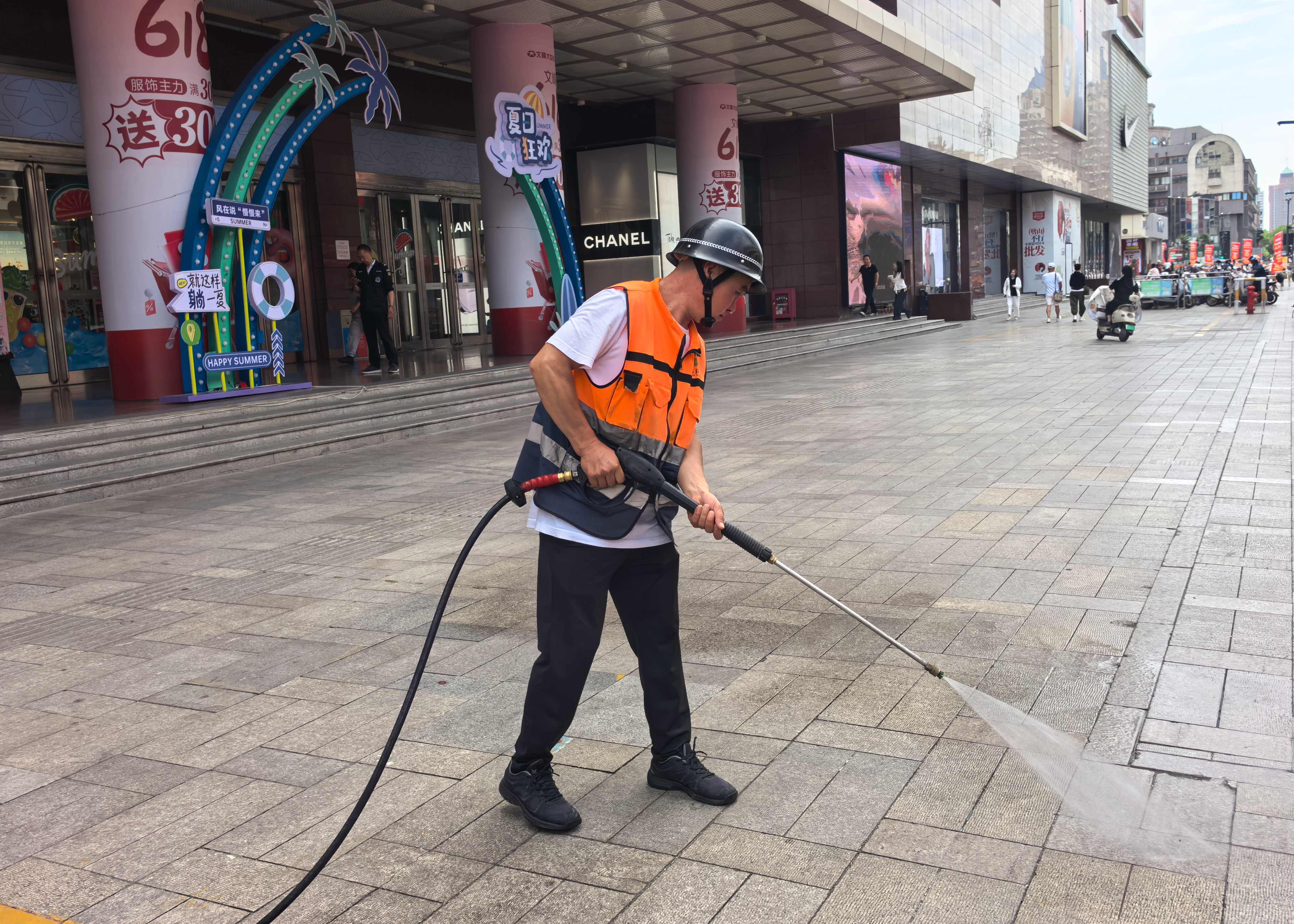 精细化理念渗透每个环节。南大街商圈通过“八步组合作业法”实现管理升级。清晨普扫、日间擦拭设施、铲除顽固污渍、清掏雨水井……从“扫”到“冲”,8个环节环环相扣。5吨洗扫车负责主干道,小型设备钻进背街窄巷,32名保洁员三班倒,“以前是‘人追着垃圾跑’,现在人机协同作业。”季小飞介绍,针对人行道、广场地面的油污积尘,城西所组建应急冲洗小组快速响应。