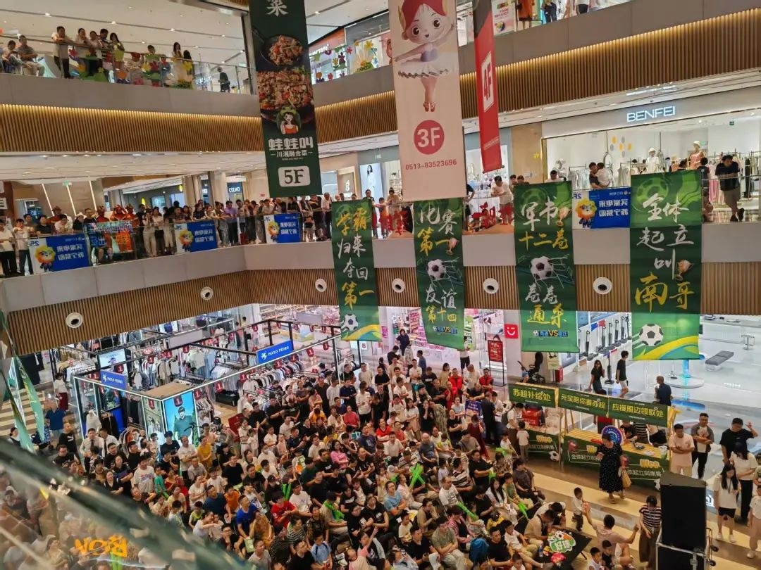 “球场考场,我们都要拿下”“苏F的F是百发百中的F”……南通万象城一楼南中庭各类“苏超”元素标语格外醒目。市民陈女士行程“明明白白”:带孩子看电影、购物、吃晚餐,然后巨屏前看球。盒马小哥李立行穿行人潮,抬眼正撞见南通队进球瞬间:“运气不错!看到我们南通队进球了!”这位来通一年的湖南小伙满心归属:“街道社区常送温暖,有爱的城市,愿球队高歌猛进!”