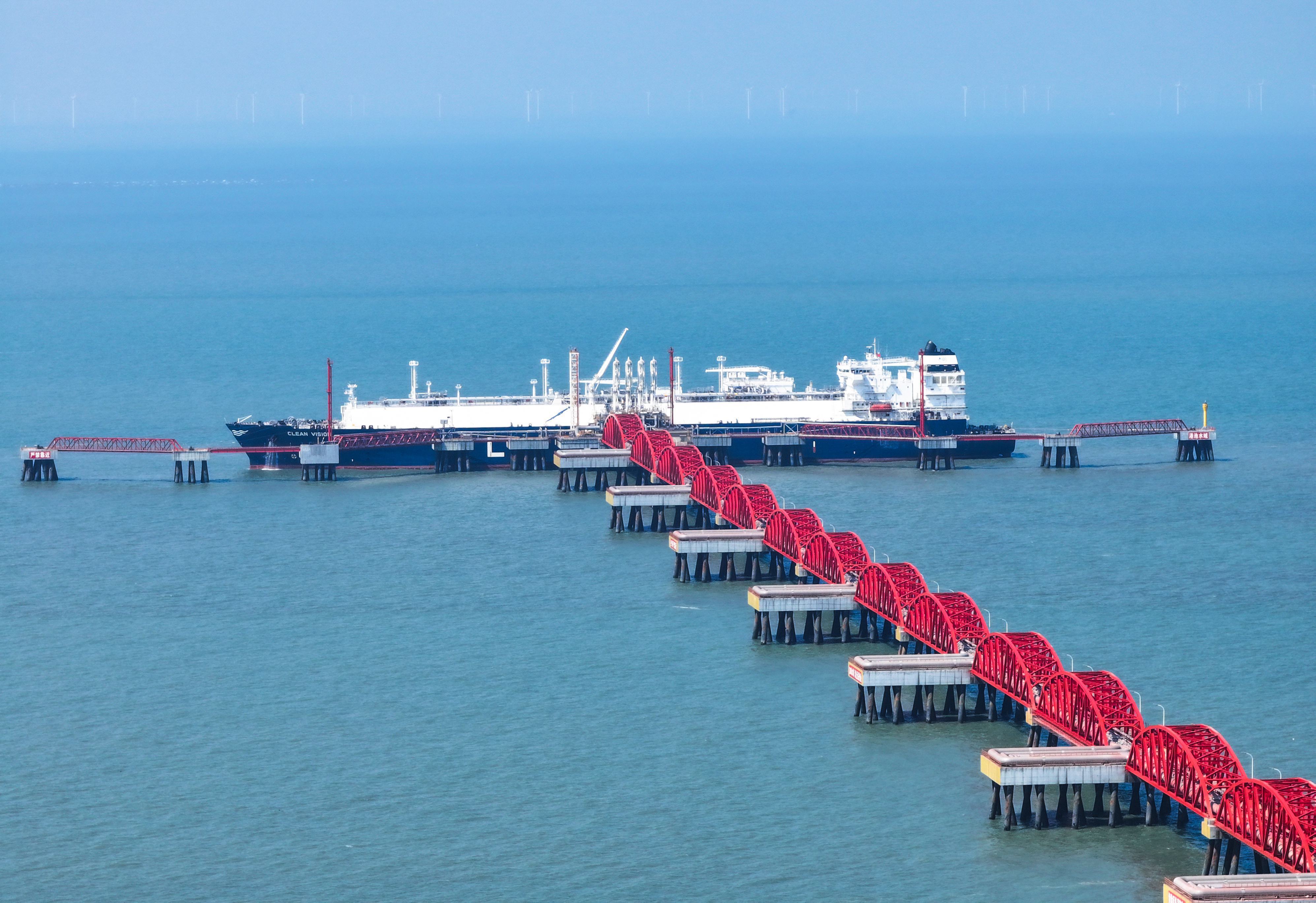 顶部夏日清晨,站在江苏南通如东洋口港黄海大桥上远眺,3平方公里的阳光岛内,12座白色或灰色的巨大储罐身上,LNG三个大写字母清晰可见。