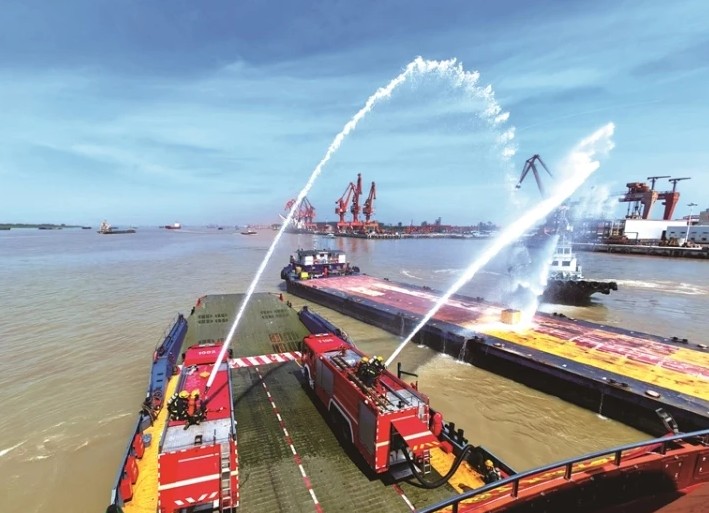 顶部4日上午,2025年如皋水上搜救综合应急演习在张靖皋长江大桥临时码头前沿水域举行,演习共出动80余名应急搜寻救助人员,动用海巡艇、水务艇、大马力消拖两用拖轮、客汽渡船等各类船艇7艘,急救、消防、气象车4辆,采用“汽渡+消防车”协同配合模式。经过近一个小时的紧张处置,圆满完成各科目预设任务。 彭军君文 徐伟欣摄