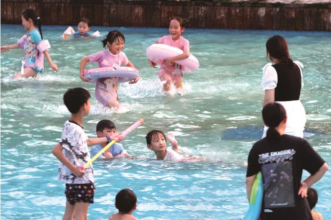昨日傍晚,市区濠东绿苑白沙滩儿童戏水池吸引孩子们和家长戏水觅清凉。小暑节气来临,通城这两天持续高温,白沙滩成为亲子消暑纳凉的好去处。记者 尤炼