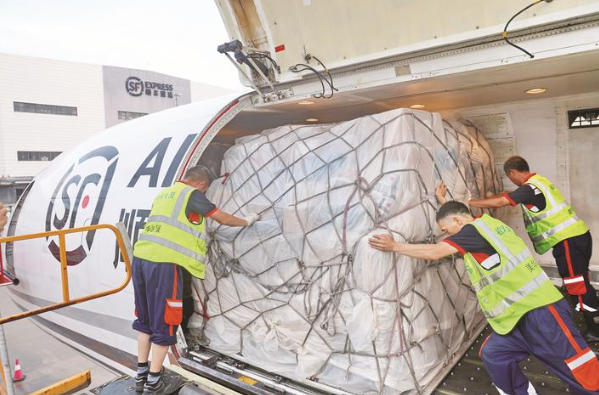 12日清晨,工作人员在南通兴东国际机场装运水蜜桃。7月以来,南通兴东国际机场迎来水蜜桃运输旺季,顺丰全货机每天运输约5000件15吨。机场全面优化业务流程,实现水蜜桃的拼装、复磅、装机90分钟内完成,这些从无锡阳山运来的水蜜桃通过搭乘顺丰全货机及时发往鄂州、深圳等全国各地。