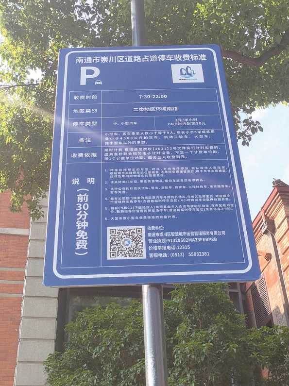位于南大街商圈的环城南路共有46个道路停车泊位,由崇川产发集团下属崇川区智慧城市运营管理服务有限公司运营管理。此前,对于中小型汽车,这里的停车收费标准为:前15分钟免费,2小时内每15分钟2元,2小时后每15分钟3元,24小时封顶100元。调整后,这里的停车收费已经变成半小时2元,24小时封顶30元,且前30分钟免费。相关收费标准明晰地公布在路边的收费公示牌上。