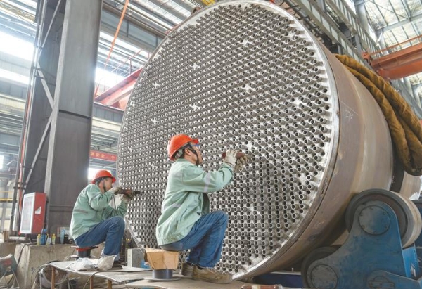 昨天,在位于海安市的江苏华兴压力容器有限公司车间内,工人正在赶制压力容器订单。据了解,江苏华兴压力容器有限公司是一家主要从事各类压力容器研发、设计、生产、安装的高新技术企业,产品远销欧美等国家和地区,目前工人正开足马力赶制订单。 翟慧勇摄