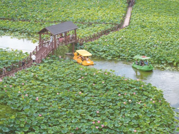 19日,游客在如皋市平园池村千亩藕池文化园赏荷游览。近年来,平园池村积极打造荷藕产业链条和荷乡旅游品牌,获评中国美丽休闲乡村、全国乡村治理示范村、全国文明村等。 记者 许丛军摄