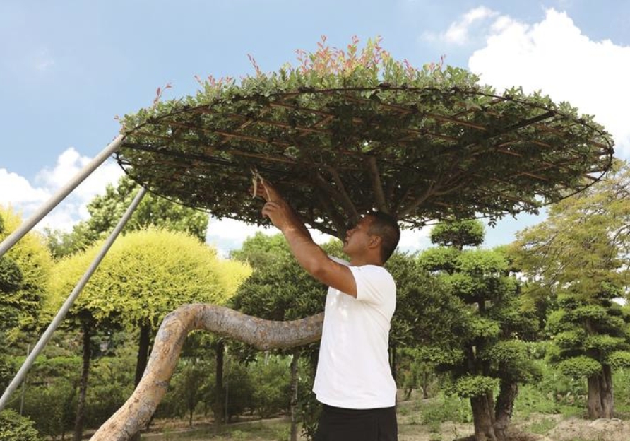 “练好内功,积极面对市场。”钱星星说,有活儿时就认真干,暂时没活儿时就把苗圃打理好,“比如,将大叶女贞嫁接成川滇女贞,东北榆嫁接成黄金榆。将紫薇进行蟠扎,打造成瓶状形,寓意紫气东来、平安发财。”