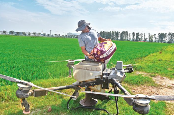 昨天,在如皋市城北街道戴庄村润杰农场水稻种植基地,种田大户在给植保无人机添加水稻拔节孕穗肥。