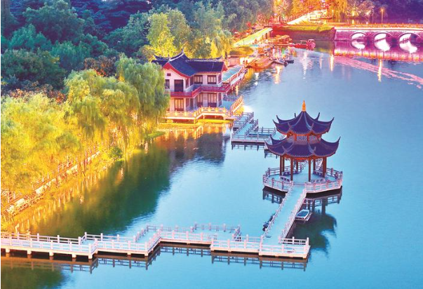 昨天,无人机航拍位于南通博物苑东侧的九曲桥新貌。数十年来,九曲桥是很多市民漫步休闲的好去处。为了保证市民和游客的游览安全,相关方面决定对混凝土结构的九曲桥进行“原样修复”,维修提升的九曲桥保留了原有的风貌和样式。如今,九曲桥全新亮相,将成为找寻城市记忆的新“网红打卡地”。 记者 许丛军摄