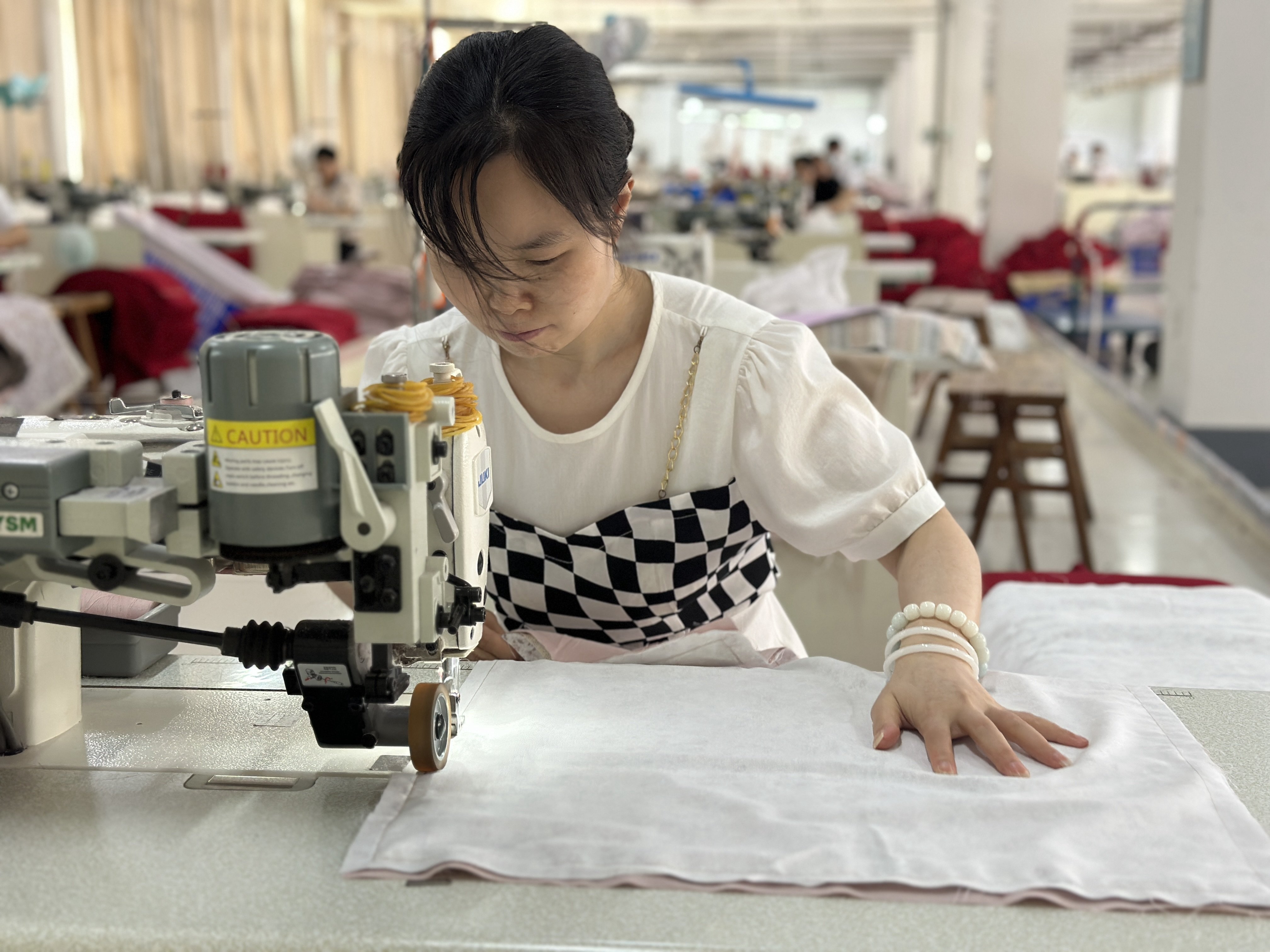 “别小看这个滚轮,有了它,生产效率得到了大大提升!”柏琳家纺首席质量官刘前说,从前,工人在缝纫时,需要同时控制布料方向、折边宽度及车缝速度,长时间作业后,双手动作就开始不协调,从而产生折边宽度不均匀、起皱等质量问题。