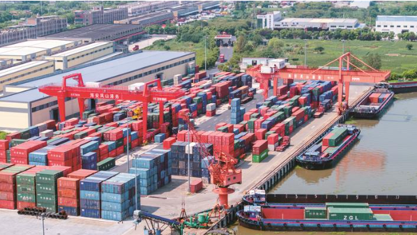 5日,位于海安商贸物流产业园的凤山头,集装箱装卸繁忙有序,这些货物经海安ICT场站发往上海外高桥港口出口国外。近年来,海安市积极提升内河航运能力,双向开行ICT进出口航班,促进与华南、华北以及长江中上游地区的集装箱物流和贸易往来。 翟慧勇摄