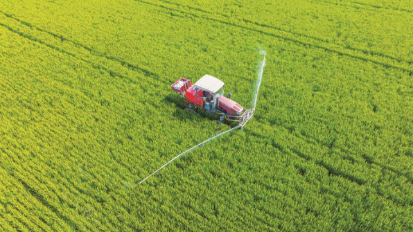 6日,海安市角斜镇范堑村村民驾驶植保机械在水稻田间进行喷洒药物作业。连日来,我市各地农民抢抓农时,加强田间管理。 翟慧勇摄
