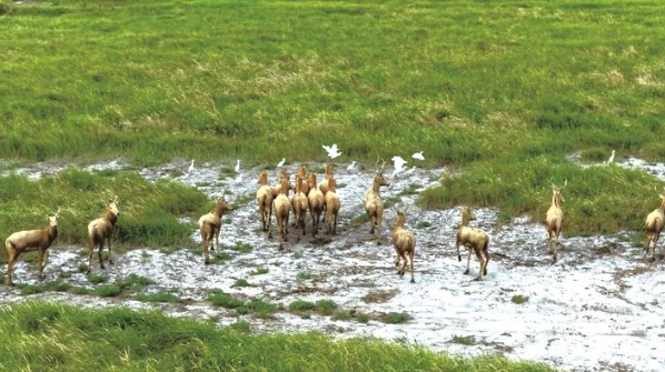 昨天在如东小洋口风景区拍到的野生麋鹿群。2023年2月,如东地区首次出现成群的野生麋鹿。2年多后,麋鹿群的数量已从最初的30余头增长至目前的上百头。 钱咸华摄